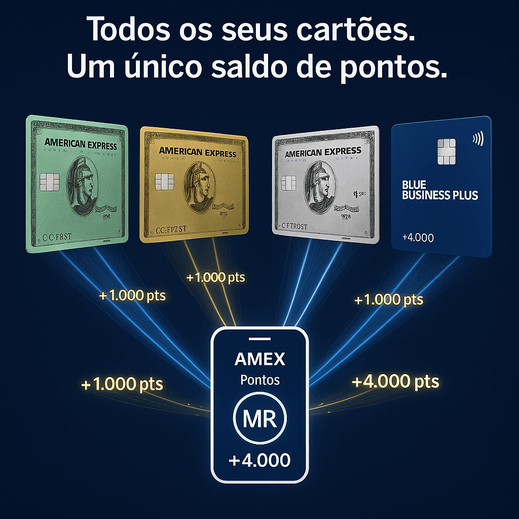 E o melhor: todos os pontos dos seus cartões AMEX (pessoais e business) se acumulam em uma única conta Membership Rewards, facilitando o controle.