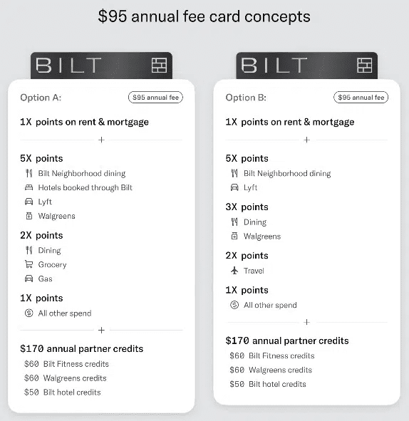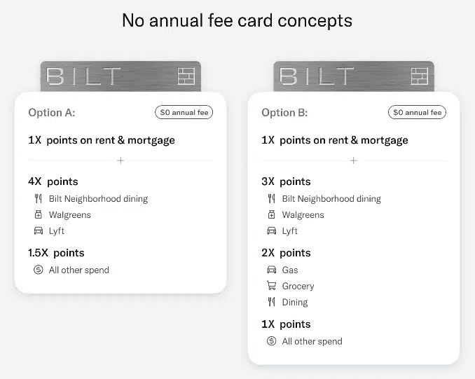 Além disso, o Bilt está fazendo pesquisas com seus clientes para oferecer novos tipos de cartões. Atualmente, a empresa está testando novas opções – divididas em três categorias: