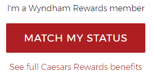 Link: Caesars Rewards Status Match - Ação: Clicar no botão “I am a Wyndham Rewards member, match my status” para obter o status Caesars Diamond.