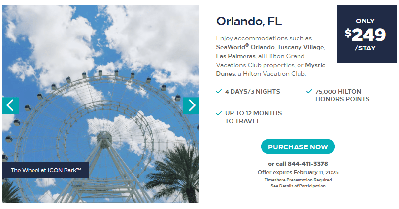 Se você não se incomoda com uma apresentação de 2 horas e já estava planejando viajar para lugares como Orlando, Las Vegas, Myrtle Beach, Gatlinburg, Hilton Head ou até mesmo curtir o Hawaii, essa oferta pode ser uma boa oportunidade. Você paga um valor baixo, garante diárias com desconto e ainda acumula pontos para futuras viagens.