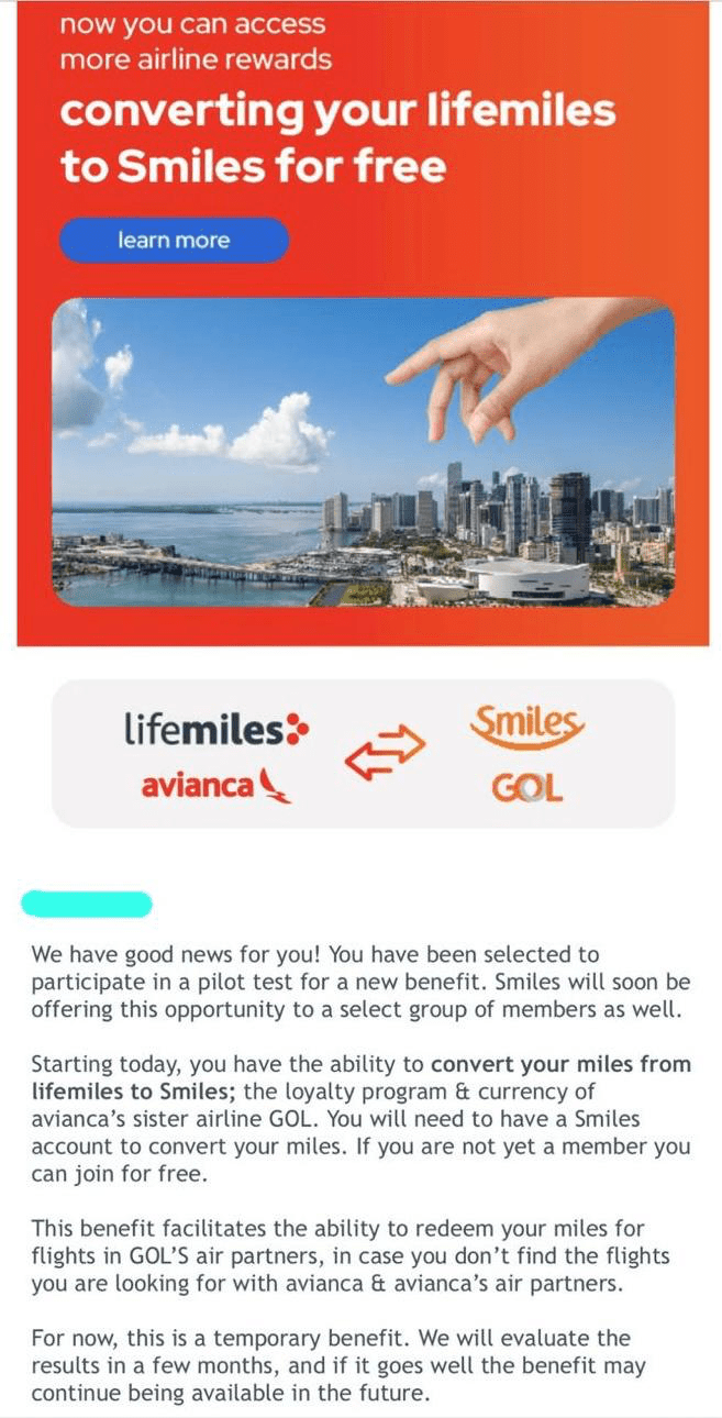 A Avianca tem uma novidade legal para alguns membros do programa LifeMiles nos EUA. Agora, você pode transferir pontos do LifeMiles para o programa Smiles da GOL, com uma taxa especial: 1 ponto LifeMiles vira 2.923411 pontos Smiles.